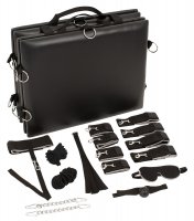 There are 8 rings on each side of the bondage board and one ring at the head and foot end, into which the enclosed restraints can be quickly hooked with their carabiners. Included are handcuffs, leg restraints, neck restraints, rope, chain, eye mask, ball gag, whip and much more.